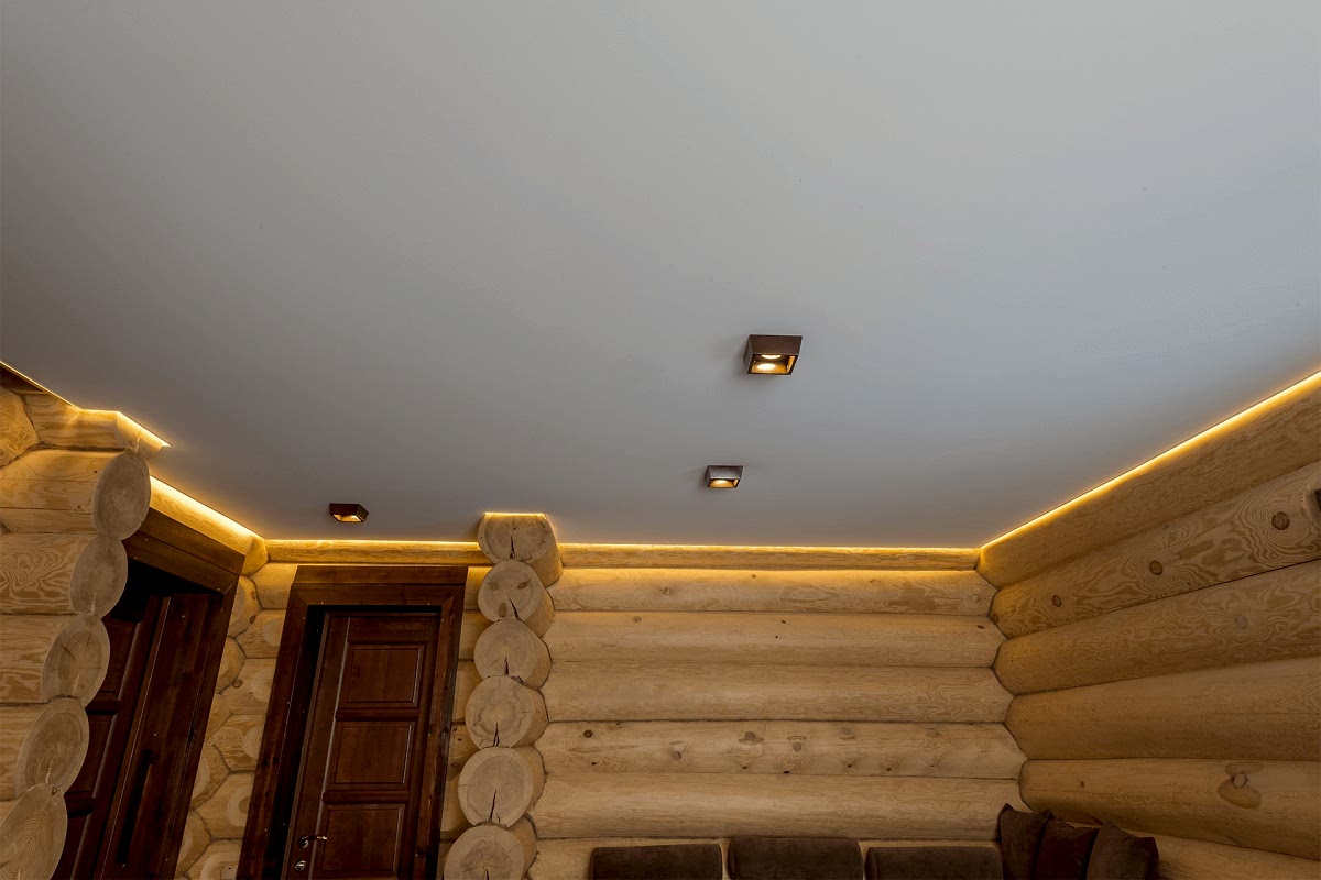 Белый натяжной потолок в деревянном Пин Ап